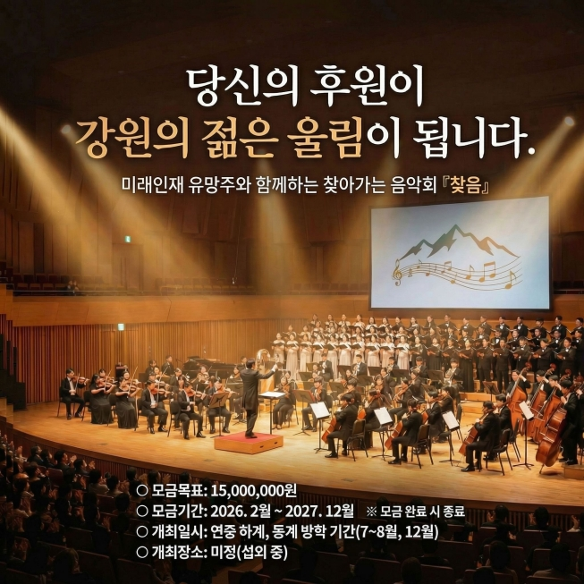 전희선 강원특별자치도 지역소멸대응정책관은 “「찾음」 음악회 개최 시 기부자를 초청해 기부금이 의미 있게 사용되고 있음을 직접 확인할 수 있도록 할 계획”이라며 “강원자치도를 사랑하는 분들과 K-클래식의 미래를 응원하는 많은 분들의 관심과 참여를 기대한다”고 말했다.