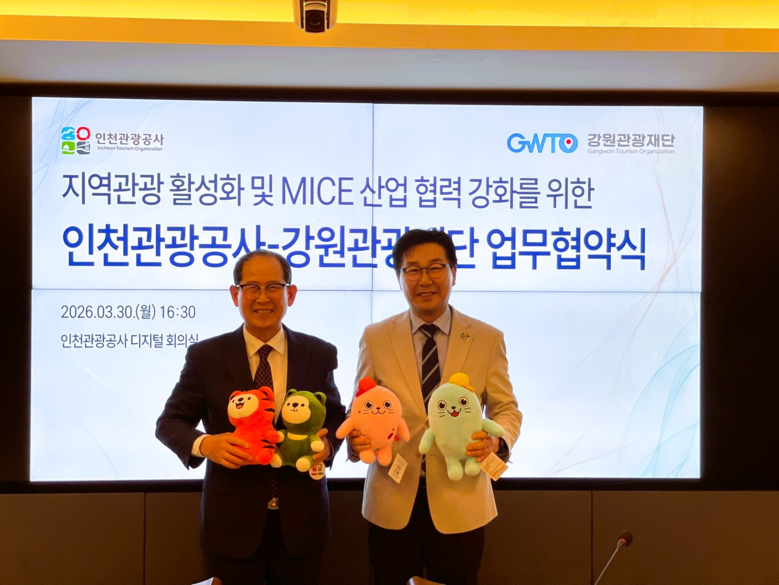[강원도 세계타임즈=김민석 기자] 강원관광재단(대표이사 최성현, 이하 재단)이 수도권 관문 도시 인천과 협력하며 관광 및 MICE 산업 경쟁력 강화에 나섰다. 재단은 지난 3월 30일 인천관광공사와 지역관광 및 MICE 산업 활성화를 위한 업무협약을 체결했다고 밝혔다.