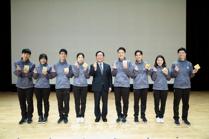 이어 특강을 마친 한 회장은 신입사원들과 일일이 악수를 나누며, 디지털 세대인 신입사원들이 일과 삶, 건강의 스마트한 자기 관리를 통해 디지털 신한을 이끌어 가라는 의미로 스마트 밴드를 선물했다.