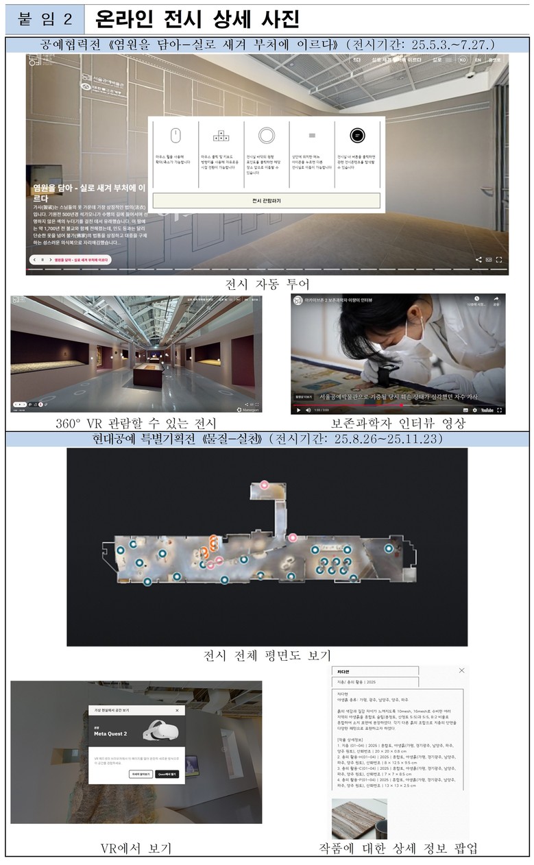 - 국·영문 접속 주소 분리로 글로벌 접근성 높이고, ‘자동 투어’ 도입해 관람 편의 개선 [서울 세계타임즈=이장성 기자] 서울공예박물관(관장 김수정)은 2025년 개최된 주요 특별기획전 <염원을 담아: 실로 새겨 부처에 이르다>와 <물질-실천> 2편을 온라인 전시로 재구성하여 공개한다고 밝혔다. 이번 온라인 전시는 시공간의 제약 없이 박물관의 전시를 관람할 수 있도록 기획되었으며, 고해상도 360° 촬영 기술을 도입해 전시장의 동선과 현장감을 생생하게 구현했다.