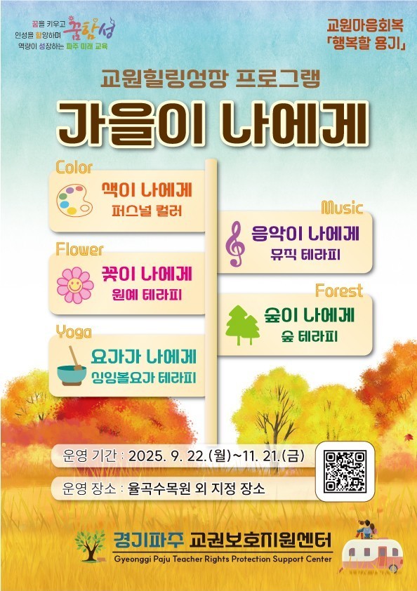 [파주시 세계타임즈=송민수 기자] 경기도파주교육지원청(교육장 전선아)은 10월 1일(수)부터 12월까지 관내 교원의 정서 회복과 마음 돌봄을 목표로 「가을이 나에게 교원 힐링 성장프로그램」을 운영하고 있다.