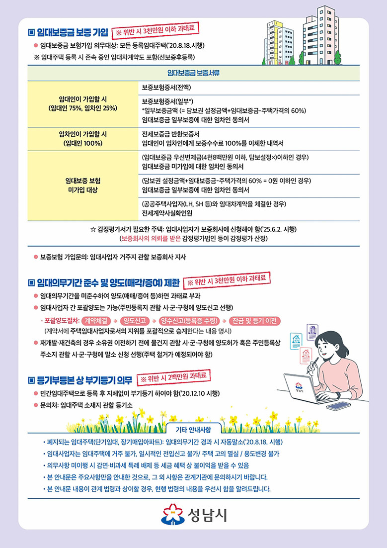 성남시 관계자는 “이번 안내문이 임대사업자의 법령 이해도를 높이고 의무 이행을 돕는 계기가 될 것”이라며 “앞으로도 투명한 임대차 시장 질서 확립과 안정적인 주거 환경 조성을 위해 지속적으로 노력하겠다”고 말했다.