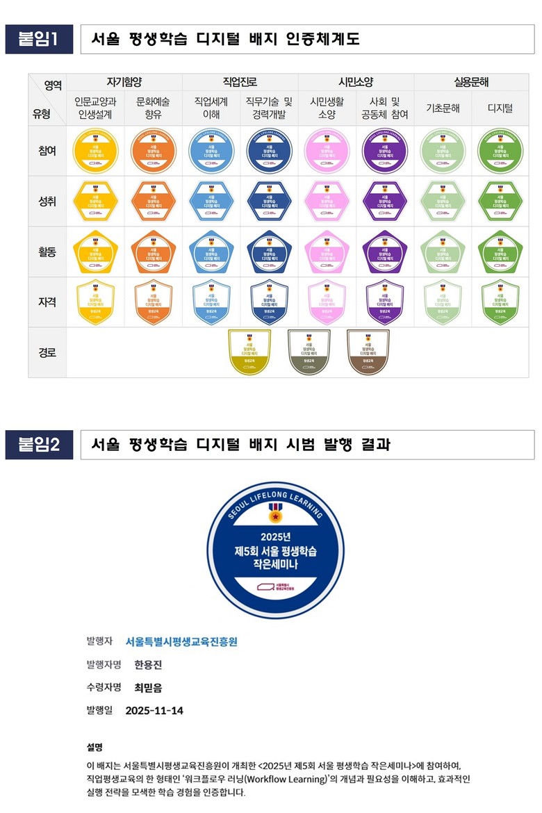 서울시평생교육진흥원은 2026년부터 광역 평생학습연수센터 교육과정부터 디지털 배지 도입을 본격화하고 발행을 단계적으로 확대해 나갈 계획이다.