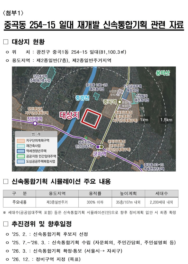 한편 서울시는 이번에 신속통합기획이 확정된 중곡동 245-15 일대 주민공람, 의견 청취 등 관련 절차를 신속히 진행해 올해 중 구역 지정을 목표로 사업을 추진할 계획이다.