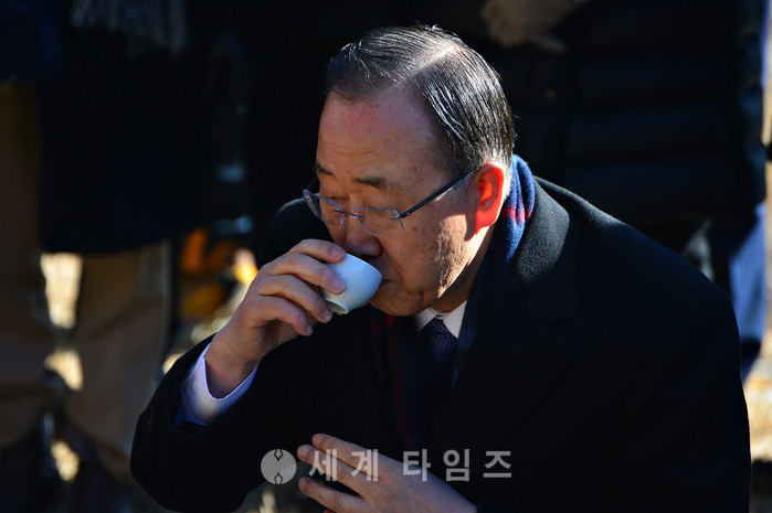 반기문 전 유엔 사무총장과 부인 유순택 여사가 14일 반 전 총장의 고향인 충북 음성군 원남면 상당리 행치마을의 선친묘소를 참배한 뒤 음복하고 있다. 2017.01.14
