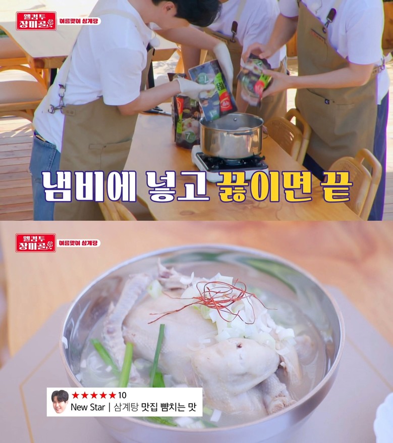 어제(9일) 방송된 6화에서는 장미골 주인장들이 초복을 앞두고 손님들에게 대접할 특별 보양식을 먼저 요리하고 맛보는 모습이 공개됐다. 보양식의 대명사, 삼계탕을 메뉴로 선택한 트롯맨 4인은 닭을 손질해 삶는 대신 미리 주문해 배송받은 하림 삼계탕 냉동 제품을 냄비에 넣고 끓여 삼계탕을 손쉽게 완성했다. 부추, 통마늘 등 먹고 싶은 재료를 추가하는가 하면 백김치를 곁들여 먹는 모습이 눈길을 끌었다. 진한 국물이 남자, 소면을 삶아 넣고 삼계국수로 즐기는 모습이 식욕을 한껏 자극했다.
