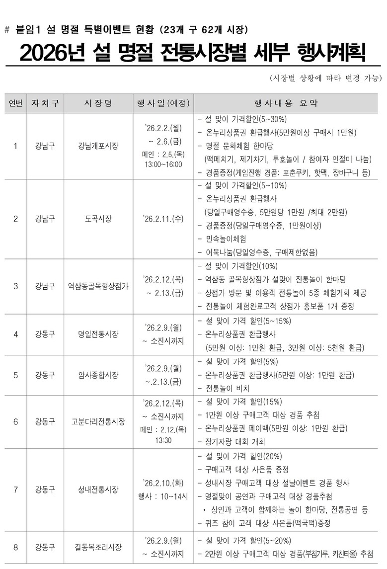 가격 할인과 함께 명절 분위기를 살리는 전통문화 공연과 체험 행사(떡메치기, 제기차기 등)도 마련된다. 이 밖에도 시장별 온누리상품권·사은품 증정 등도 함께 진행해 시민들의 설 장바구니 부담을 낮추고 전통시장 소비를 촉진할 계획이다.