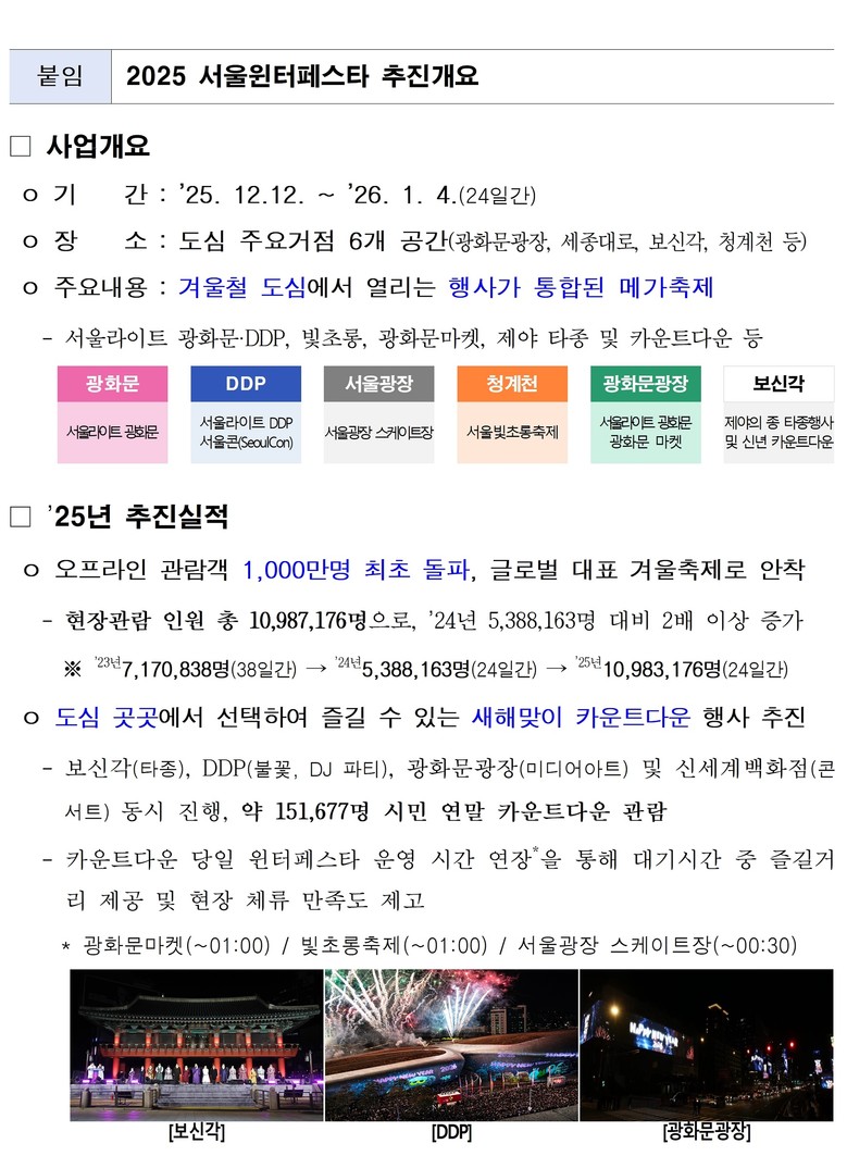 ‘2025 서울윈터페스타’는 2025년 12월 12일부터 지난 1월 4일까지 총 24일간 광화문광장‧청계천‧DDP 등 도심 7개 명소를 잇는 통합형 겨울 축제로 운영됐다. 축제는 개막 20일 만에 누적 1천만 방문객을 돌파했으며, 축제 기간 중 총 1,098만 명이 방문해 전년 대비 2배 이상 관람객이 증가, 명실상부한 서울시 대표 겨울 축제로 자리매김했다.