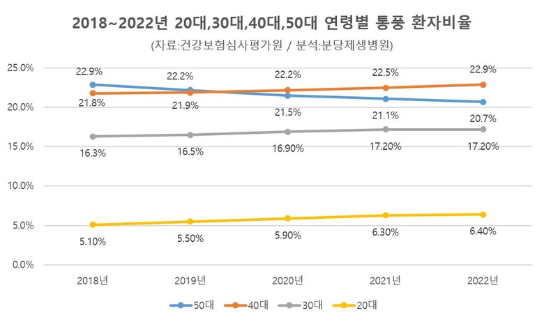 | ▲2018~2022년 20~50대 연령별 통풍 환자수(자료: 건강보험심사평가원 / 분석:분당제생병원) |