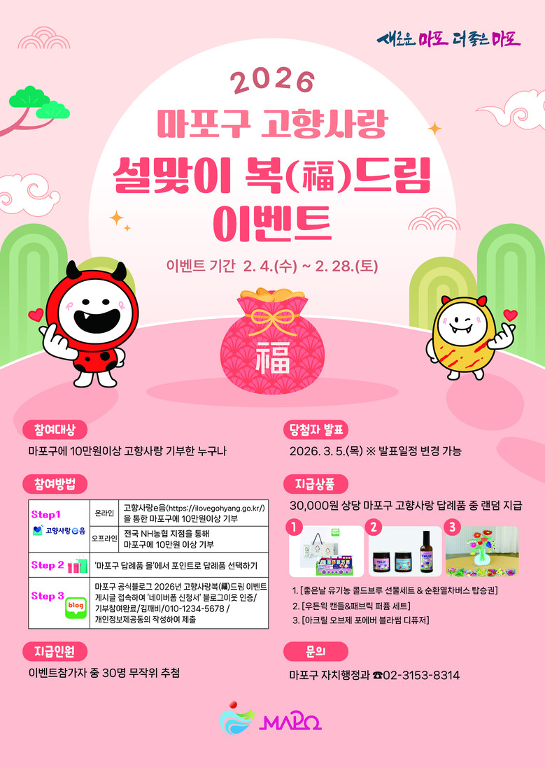 - 마포구 고향사랑기부제 참여자 30명 선정, 3만 원 상당 답례품 추가 제공 [마포구 세계타임즈=이장성 기자] 마포구(구청장 박강수)는 설 명절을 맞아 고향사랑기부제 참여를 확대하고 기부 문화를 확산하기 위해 ‘2026년 설맞이 고향사랑 복(福)드림 이벤트’를 2월 4일부터 28일까지 운영한다.