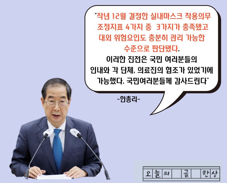 오늘 20일 한덕수 국무총리는 코로나19 중앙재난안전대책본부 회의에서 "30일부터 일부 시설 등을 제외, 실내마스크 착용 의무를 권고로 변경 논의중."이라고 밝혔었고 이가 확정이 된 것이다.