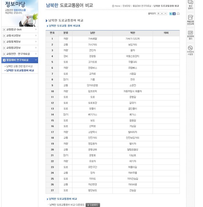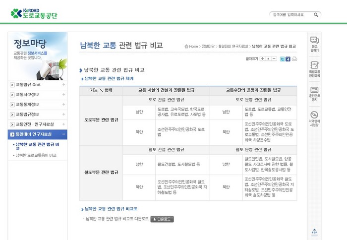 도로교통공단(이사장 직무대행 정순도)은 통일에 대비해 북한의 교통정책을 이해하고 향후 교육프로그램 개발을 위해 강원대와 공동 수행한 프로젝트의 연구결과를 12일(금) 도로교통공단 홈페이지 ‘정보마당-통일대비 연구자료실’ 코너를 통해 국민에게 무료 공개한다고 밝혔다.