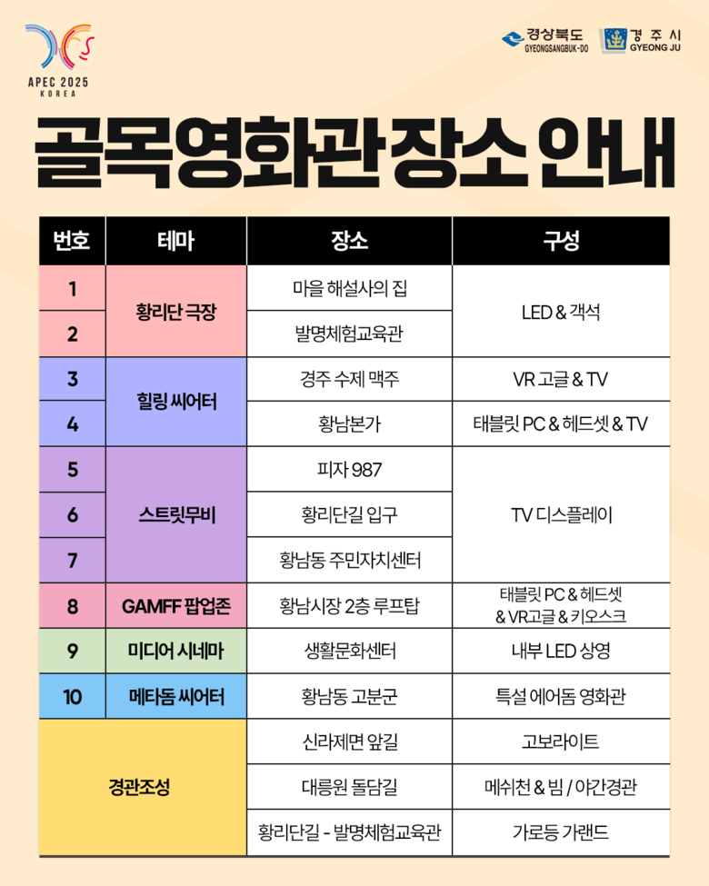 골목영화관은 ‘메타무비파크(황남동 고분군)’와 ‘골든씨네타운(황리단길 일원)’ 두 구역으로 나뉘어 운영된다.