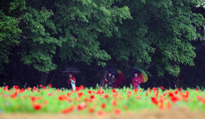 12일 경남 함양군 함양읍 상림경관단지에서 봄비를 머금고 활짝 핀 양귀비꽃을 감상하며 걷고 있다.