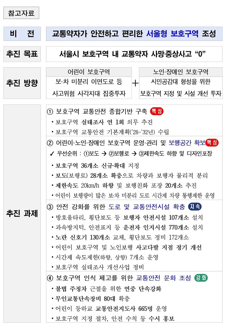 한편 서울시는 단순 시설 확충을 넘어 사고 발생 특성과 보행환경을 종합적으로 고려한 맞춤형 개선 대책으로, 보호구역을 단순한 규제 공간이 아닌 보행약자가 안심하고 이동할 수 있는 생활 안전 공간으로 정착시킬 계획이다.