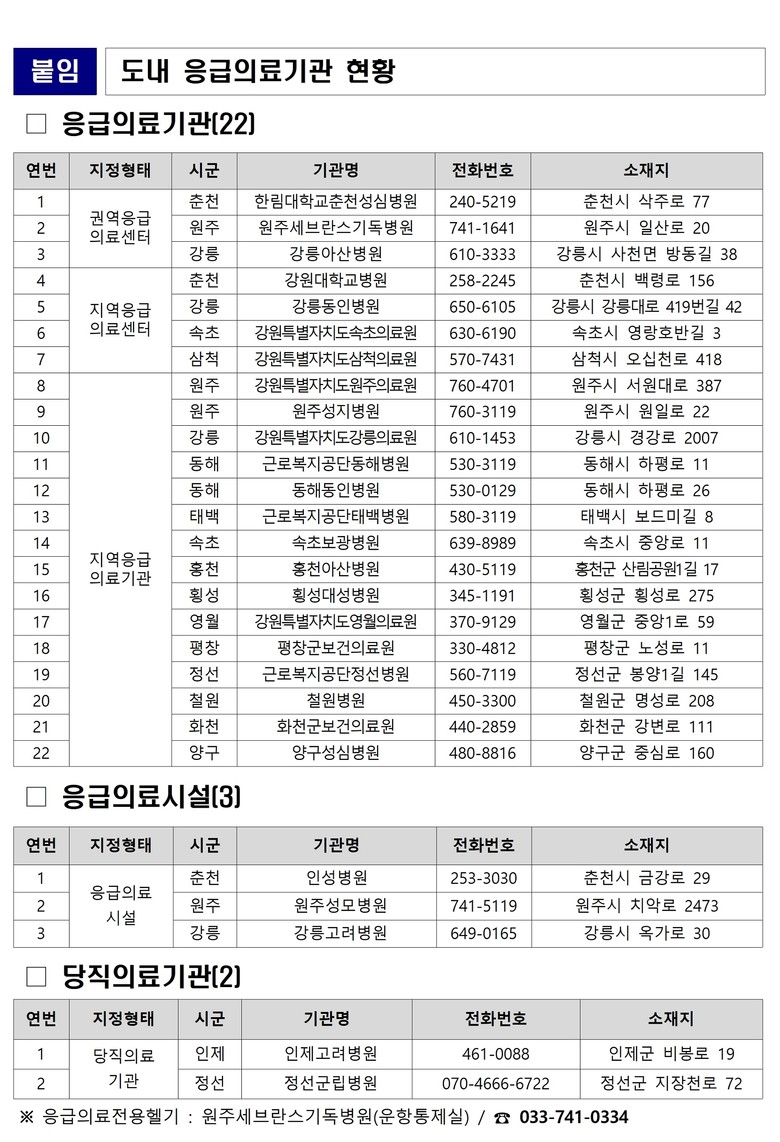 < 문 여는 병‧의원‧약국 운영 정보 안내 > - 보건복지상담센터(129), 구급상황관리센터(119), 시·도 콜센터(120) - 응급의료포털(www.e-gen.or.kr), 강원특별자치도 홈페이지 - 응급의료정보제공(e-gen) 스마트폰 어플 활용 |