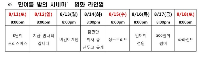 매일 저녁 8시, 풀벌레 소리가 들리는 야외 극장 ‘한 여름 밤의 시네마’가 열린다. 20년 전, 낭만적인 사랑으로 관객들의 마음을 울린 한석규와 심은하의 ‘8월의 크리스마스’부터 2년 전, 아름다운 음악과 스토리로 남녀노소 모두의 감성을 폭발시킨 영화, ‘라라랜드’까지 감성을 자극하는 영화 8편이 상영될 계획이다. 푸른 잔디 위 돗자리를 깔고 가족 또는 연인과 함께 영화를 감상하며 잠시 잊었던 낭만을 느낄 수 있기를 기대한다.