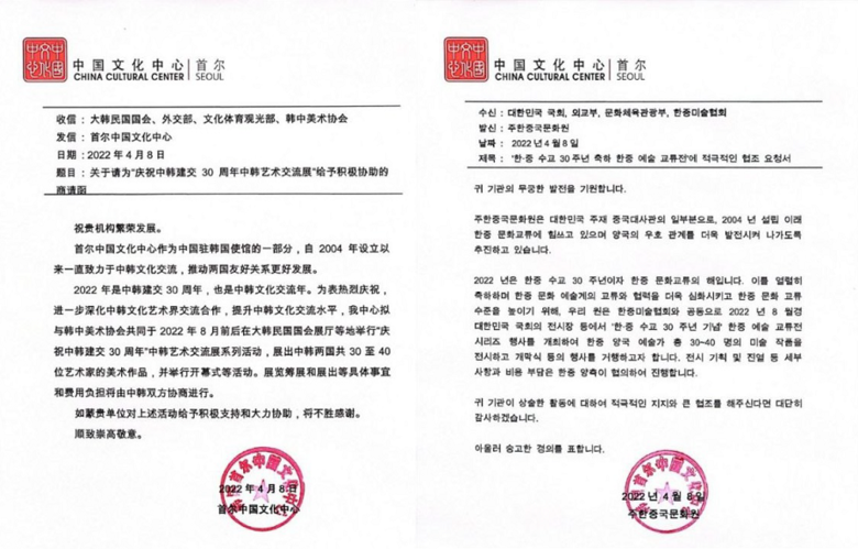 또한 관계자는 "이번 사업의 수주를 위하여 싱하이밍 대사에게 한중미술협회장자격으로 공식 요청하여 주한 중국문화원 공식외교협조공문도 우리의 국회, 외교부, 문체부 등에 보내도록 했다"며 "앞으로 우리협회가 올해 주관하는 아래의 전시에 정부(문화체육관광부) 후원 표시 및 공식로고 사용을 할 수가 있기에, 협회 전시에 참여 협회원들은 향후 개인의 팜플렛이나 이력서에 '한중수교 30주년 기념 작가' 기재와 함께 옆에 정부 공식로고도 첨부할 수가 있게 되었다"고 밝혔다.