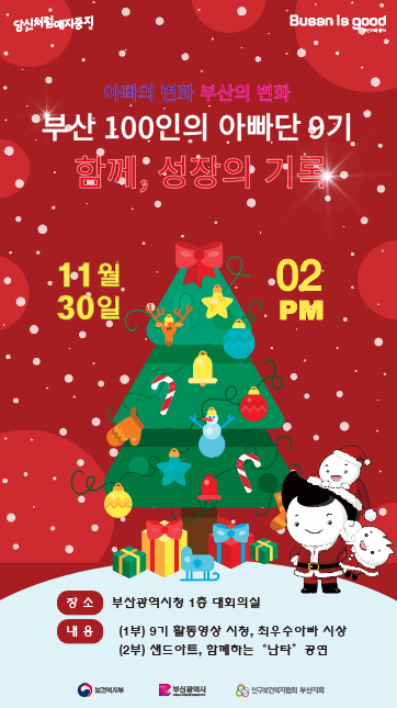 행사에는 박형준 시장을 비롯해 100인의 아빠단과 가족 150여 명이 참석해 ‘함께육아’의 소중한 의미를 되새기고 그간의 즐거움을 나눌 예정이다.
