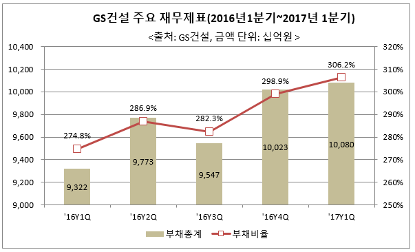 한 번 치솟기 시작한 부채비율은 걷잡을 수 없는 수준까지 커졌다. 지난해 4분기에는 부채총계가 처음으로 10조 원대를 돌파했다. 또, 올해 1분기에는 GS건설의 부채비율이 처음으로 300%대(306.2%)를 넘어섰다.