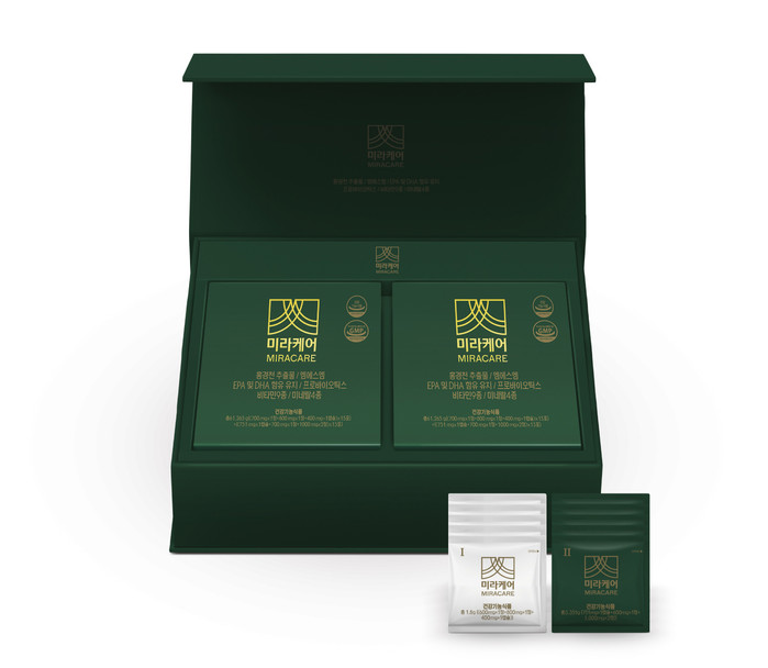 미라케어는 하루 2포 만으로 17가지 영양성분을 손쉽게 섭취할 수 있는 건강기능식품으로, 비타민 B1, 비타민 B6 등의 비타민 B군과 판토텐산, 나이아신 등의 수용성 비타민, 필수 미네랄과 프로바이오틱스 등 면역력과 활력에 도움이 되는 17가지 영양성분이 함유돼 있다.
