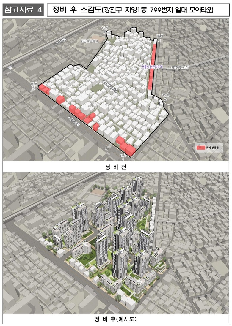 자양번영로변에 존치되는 건물과 자양전통시장과 면하는 자양번영로변의 건축물은 높이를 낮춰 주변 주거지와 조화로운 경관이 되도록하고,대상지 남측의 한강을 고려한 배치를 통해 통경축이 확보될 예정이다.