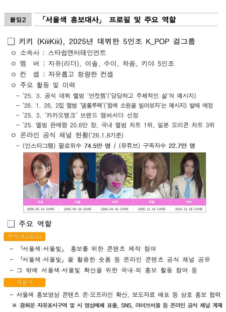 키키는 서울색 홍보대사로서 서울색·서울빛을 주제로 한 이미지·영상 콘텐츠 제작에 참여하고, 서울빛 구현 명소에서 촬영한 콘텐츠를 공식 채널을 통해 소개하는 등 서울색 확산 활동에 협력할 예정이다. 첫 콘텐츠로 남산타워, 청계천(나래교·오간수교), DDP 서울빛 명소에서 숏폼 촬영을 진행했으며, 촬영된 콘텐츠는 키키 공식 SNS 채널과 함께 서울시 공식 SNS 등 온라인 채널을 통해 순차적으로 공개될 예정이다.