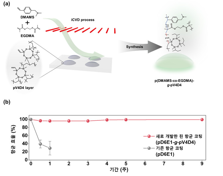 연구에서는 장기적으로 화학적 안정성과 기계적 내구성을 갖춘 항균 및 비독성 공중합체 필름을 제작해 콘택트렌즈 표면에 직접 적용했다. 이 과정에서는 기상 고분자 증착 공정(initiated chemical vapor deposition, iCVD)을 사용해 기존 액상 코팅 방식의 비균일한 코팅 문제를 해결하고, 콘택트렌즈의 투명성을 효과적으로 유지했다.
