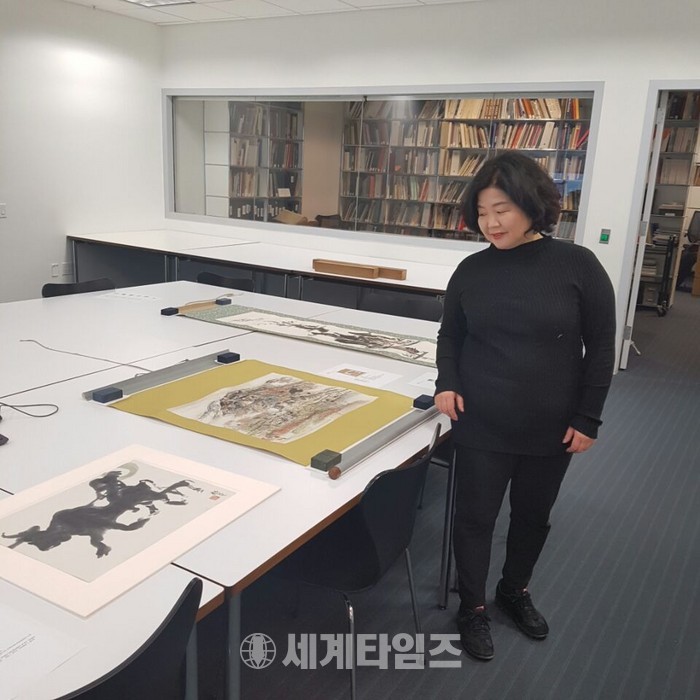 이응노미술관(관장 이지호)은 이달 초 뉴욕현대미술관에 방문하여 소장 작품 3점을 확인했다. 1958년 록펠러재단에 의해 뉴욕현대미술관의 소장품이 된 이응노의 작품은 1959년 뉴욕현대미술관 신소장품전에 소개되기도 했다. 이번에 확인한 뉴욕현대미술관의 이응노 소장품은 3점 중 2점이 족자형태로 있다. 독창적인 족자 형태로 배치된 작품을 통해 1950년대 후반에 나타나는 이응노 작품의 독특하고 고유한 정서를 느낄 수 있다.