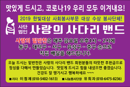 동구지체장애인협회 김연숙 회장은 “코로나19 상황에서도 장애인들을 위해서 매월 1회 맛있는 밑반찬을 지원해주는 사랑의 사다리 밴드 봉사단체에 감사함을 전한다.”고 말했다.