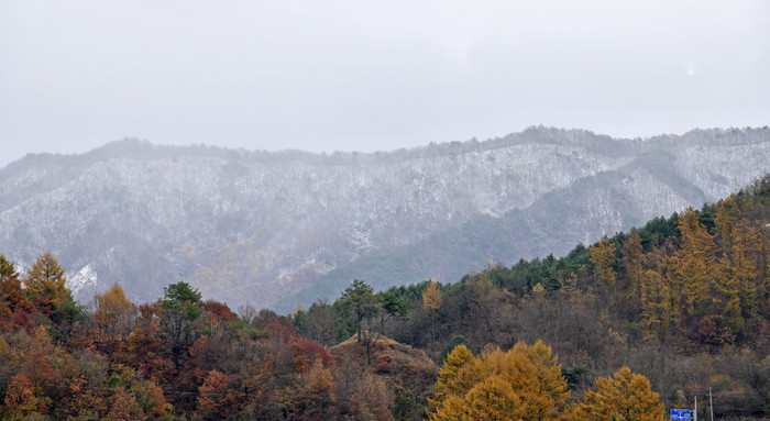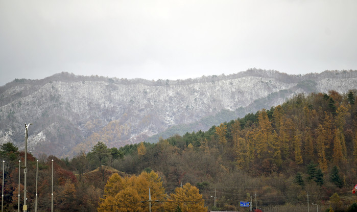 [장수=세계타임즈 임하영 기자] 12일 전북 장수군 팔공산과 마봉산에 전날 내린 눈이 쌓여 단풍과 대비를 이루고 있다.