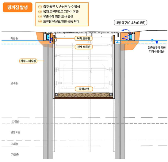 이후 매립층 하부 모래층에서 세굴이 발생하고 균질한 차수그라우팅의 품질을 확보하지 못한 상태에서 굴착 상·하부의 큰 수두차가 발생해, 상대적으로 품질이 저하된 1·2공구 확폭 구간 양쪽으로 전체 토류판이 유실돼 땅꺼짐이 확대된 것으로 보고 있다.