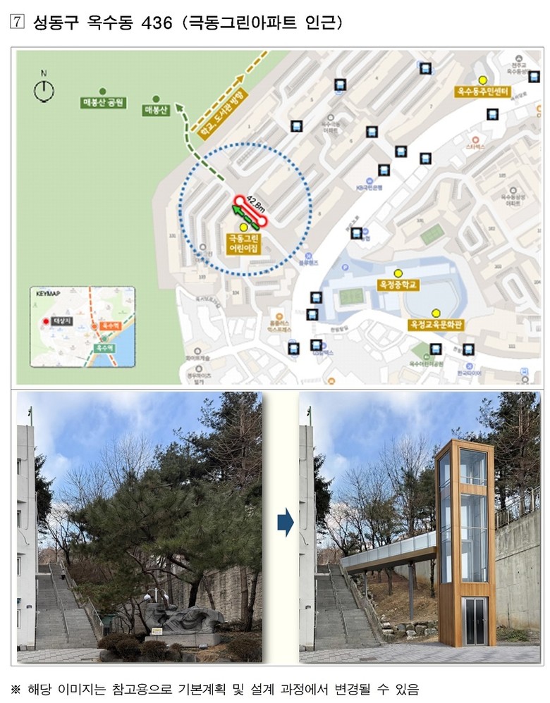 대상지에는 지역 특성에 맞춰 수직형·경사형·복합(수직+경사)형 엘리베이터를 설치해 초등학교·지하철역·버스정류장 등의 접근 편의성을 개선하고, 장애인·고령자·어린이 등 이동약자뿐 아니라 일반 시민 누구나 이용할 수 있는 ‘열린 시설’로 조성한다.