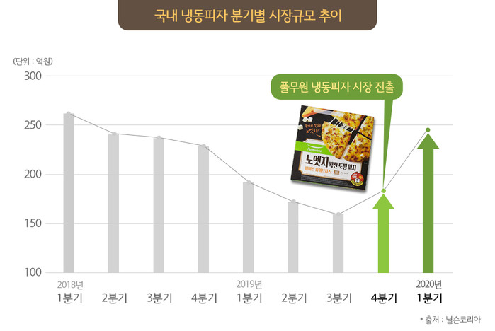 지난해 12월 ‘노엣지·크러스트 피자’를 출시하며 국내 냉동피자 시장에 본격 진출한 풀무원은 출시 두 달 만에 100만 판을 판매하는 등 새로운 활력을 불어넣고 있다. 특히, 2018년 1분기부터 하향곡선을 그렸던 국내 냉동피자 시장은 풀무원이 진출한 19년 4분기부터 터닝포인트를 맞고 다시 가파른 상승곡선을 그리고 있다.