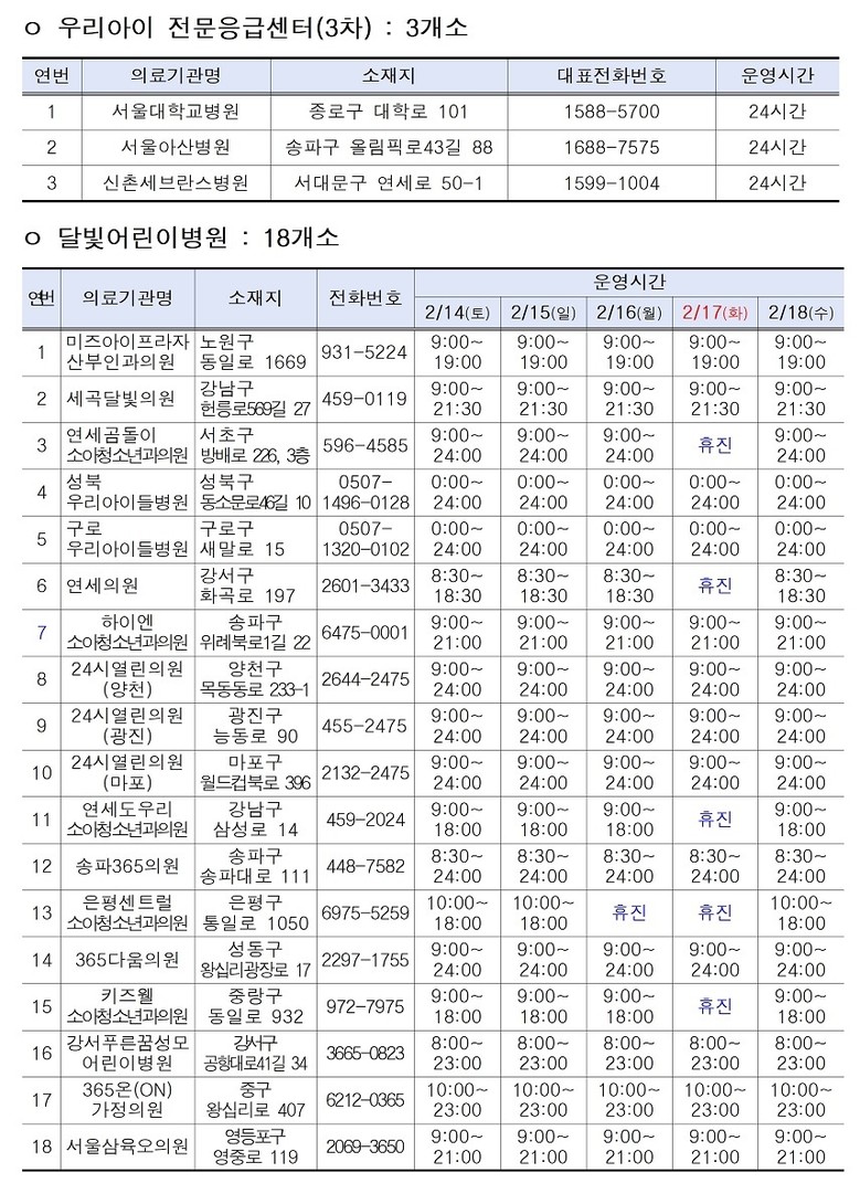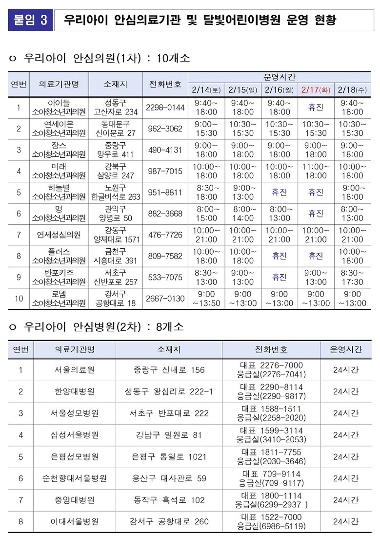 소아 환자를 위한 ‘우리아이 안심병원’ 8개소, ‘우리아이 전문응급센터’ 3개소도 24시간 운영된다. 소아 경증환자의 외래진료는 ‘우리아이 안심의원’ 10개소와 ‘달빛어린이병원’ 18개소에서 받을 수 있다.
