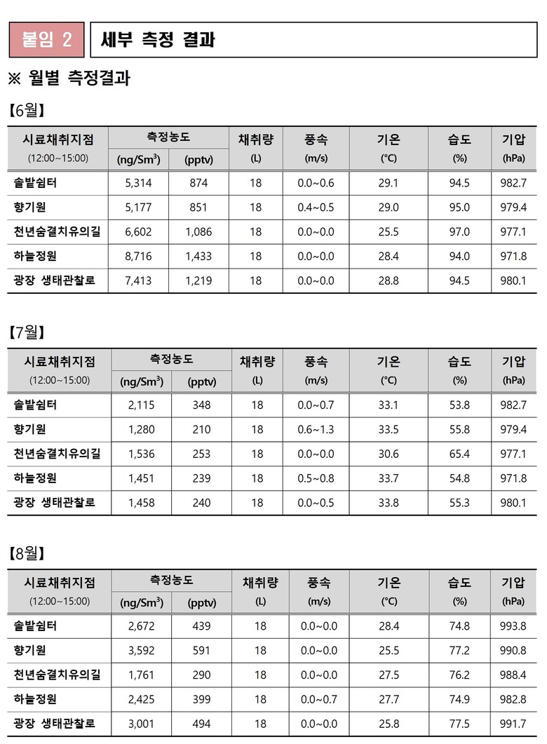 솔향수목원 내 다섯 지점을 조사한 결과, 수목 생리가 활성화된 6월에 5,314~8,716 ng/Sm3로 가장 높게 측정되었고, 7월(1,280 ~2,115 ng/Sm3)과 8월(1,761~3,592 ng/Sm3)에도 높은 수준의 피톤 치드가 방출되는 것으로 나타났다.