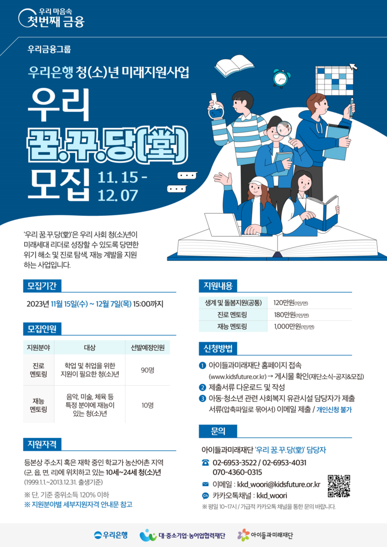 우리은행 관계자는 “우리은행은 우리 사회를 이끌어갈 미래세대의 성장을 지원하기 위한 다양한 노력을 기울이고 있다”며, “우리 청년과 청소년들이 우수한 인재로 성장할 수 있도록 지원하는 「우리 꿈.꾸.당(堂)」1기 모집에 많은 관심과 참여 바란다”고 말했다.