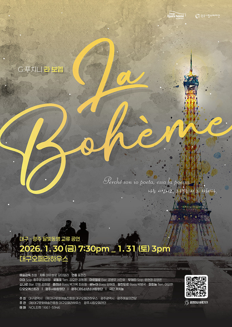 2026년 붉은 말의 해를 맞이해, 대구오페라하우스는 첫 번째 공연으로 달빛동맹의 결실인 광주시립오페라단 제작의 푸치니 오페라 <라 보엠>을 선보인다. 이번 공연은 달구벌 대구와 빛고을 광주의 문화예술 교류를 바탕으로 한 ‘달빛동맹 프로젝트’의 일환으로, 지난 12월 광주예술의전당에서 전석 매진한 공연을 대구에서 다시 한번 앵콜 공연한다.