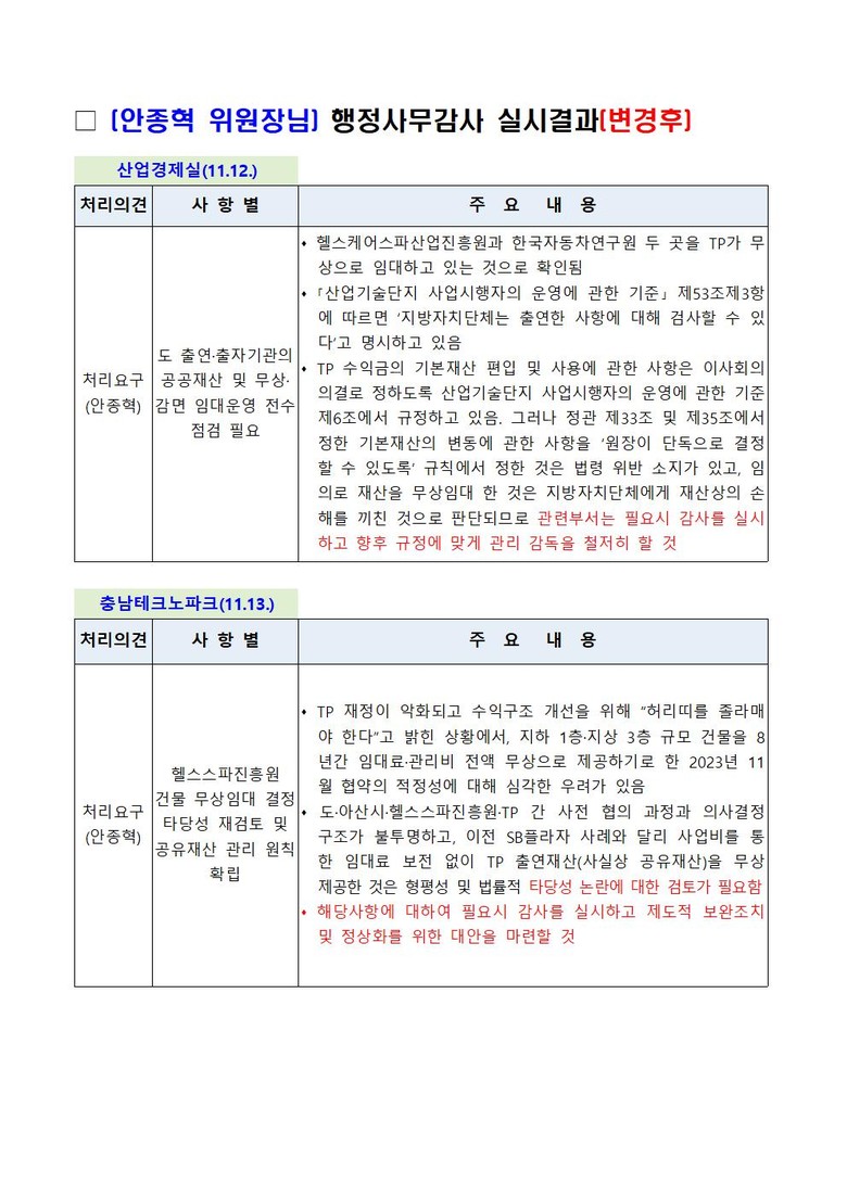 안 위원장은 해당 사안에 대해 필요 시 감사를 실시하고 제도적 보완 조치 및 정상화를 위한 대안을 마련할 것을 관계 부서에 요구했다. 아울러 향후 유사 사례가 반복되지 않도록 공공기관의 재산 관리·감독을 규정에 맞게 철저히 이행할 필요성을 강조했다.