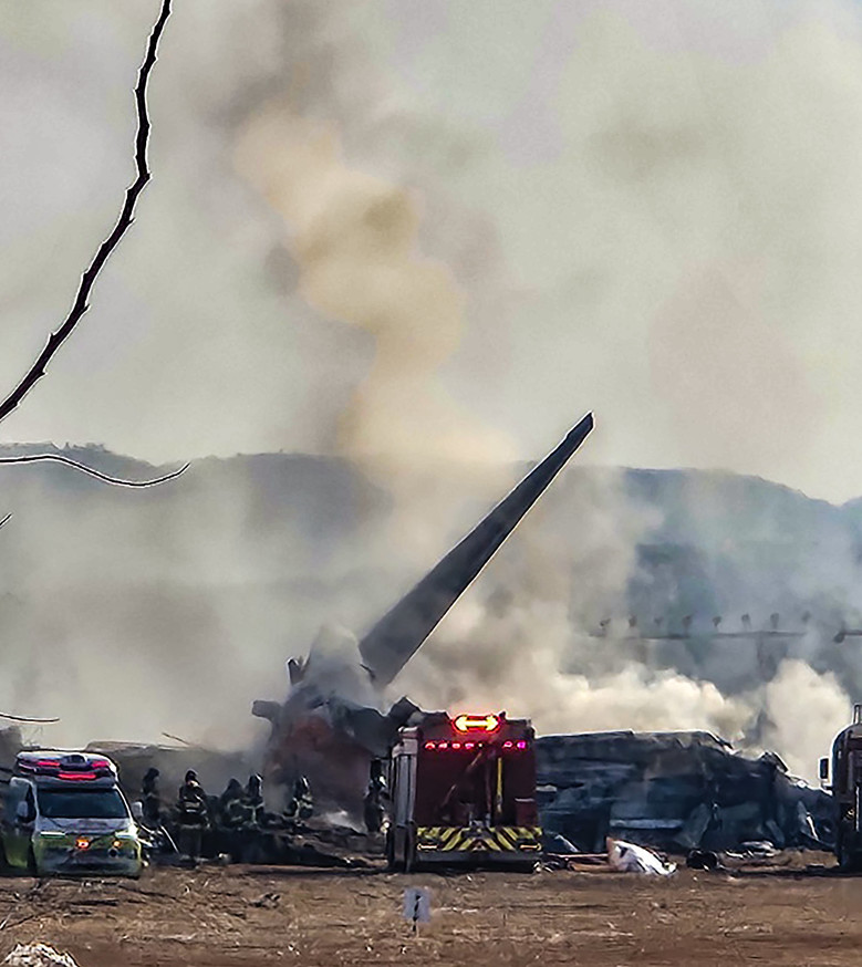 [세계타임즈 = 우덕현 기자] 29일 오전 전남 무안국제공항에서 착륙 중이던 항공기가 활주로를 이탈해 울타리 외벽을 충돌했다. 사진은 사고 현장에서 소방 당국이 인명 구조를 하는 모습. 2024.12.29