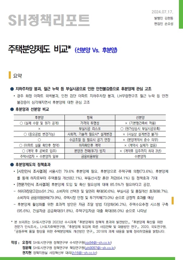 SH공사는 이 같은 내용을 골자로 하는 ‘SH정책리포트: 주택분양제도 비교(선분양과 후분양)’를 발간하고, 공사 및 SH도시연구원 누리집(https://www.i-sh.co.kr/shuri/index.do)에 게시했다고 30일 밝혔다.