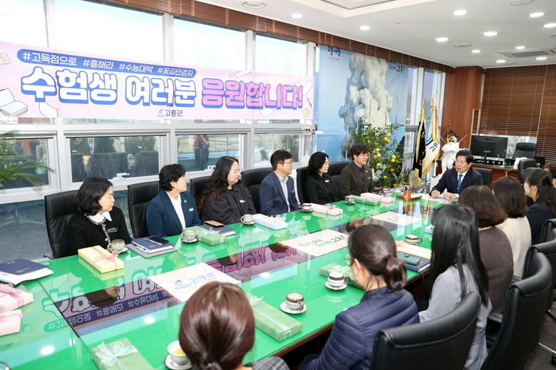 [고흥군 세계타임즈=우덕현 기자] 고흥군(군수 공영민)은 지난 4일 군수 집무실에서 ‘수능 수험생 학부모 차담회’를 개최하고, 수험생 자녀를 둔 직원들을 격려하는 시간을 가졌다.