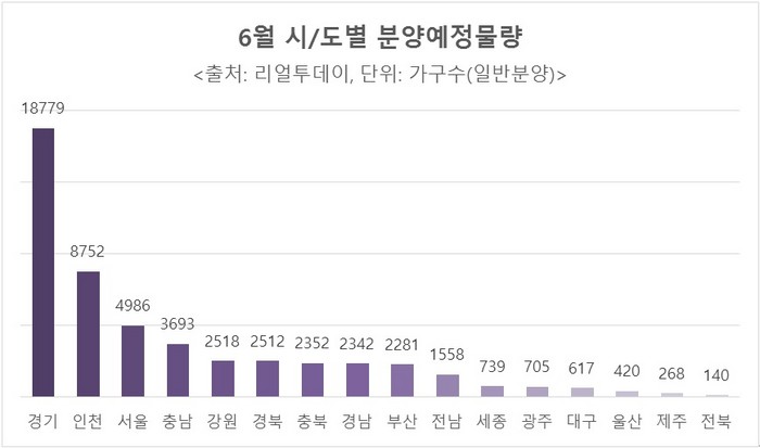 6일 부동산 리서치 전문업체 리얼투데이에 따르면, 6월 한 달간 전국 69곳에서 총 6만4000여 가구를 분양한다. 이 가운데 일반분양은 5만2662가구(임대 및 오피스텔 포함)다.
