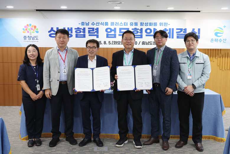 도는 5일 도청 회의실에서 전형식 정무부지사와 문동춘 ㈜은하수산 경영총괄 사장 등이 참석한 가운데, ‘충남 수산식품 클러스터 유통 활성화를 위한 상생협력 업무협약’을 체결했다고 밝혔다.