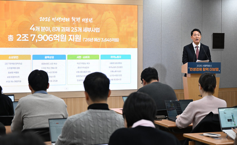 서울시는 ▴소상공인 ▴골목상권 ▴소비자 ▴취약노동자 등 경제불황 속 가장 먼저 위기에 직면하는 4대 계층에 대한 활력 회복을 주요 내용으로 하는「2026년 민생경제 활력 더보탬」을 9일(월) 발표했다. 총 2조 7,906억 원을 지원해 4대 분야 8개 핵심과제, 25개 세부사업을 추진할 계획이다.