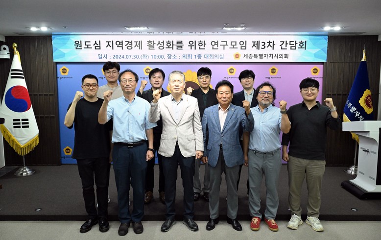 [세종 세계타임즈=이채봉 기자] 세종특별자치시의회(의장 임채성)는 7월 30일 의회 청사 1층 대회의실에서 원도심 지역경제 활성화를 위한 연구모임(대표의원 김충식, 이하 연구모임) 제3차 간담회를 개최했다. 이날 ‘원도심 지역경제활성화 기반시설 기본계획수립 연구용역‘의 추진 상황을 점검하고 조치원 일원 현장방문 또한 실시했다.