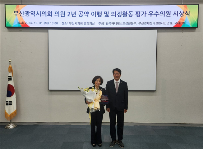 이번 시상식에서는 제9대 부산시의회 후반기 윤리특별위원장을 역임하고 있는 김효정 의원이 공약 이행 분야에서 가장 뛰어난 성과를 보였다는 평가와 함께 수상의 영예를 안았다.