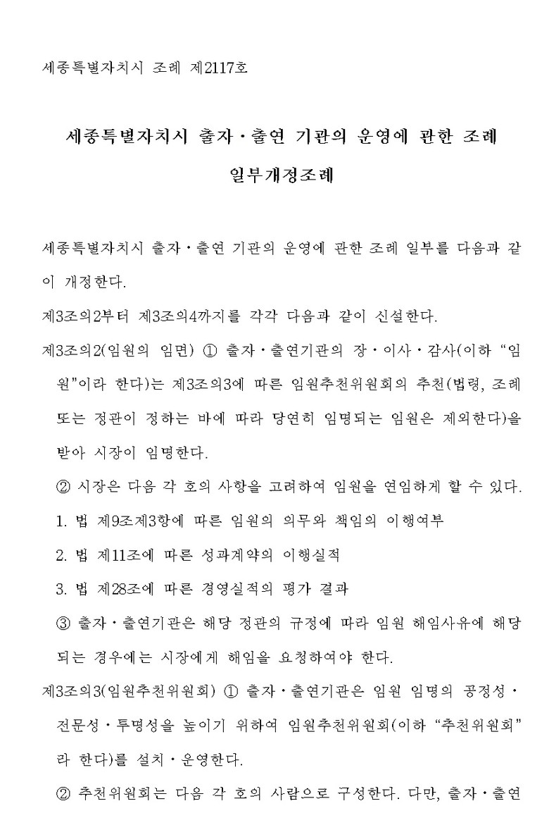 [세종 세계타임즈=이채봉 기자] 세종특별자치시의회에서 재의결된 세종특별자치시 출자ㆍ출연 기관의 운영에 관한 조례 일부개정조례를 「지방자치법」 제32조제6항 후단에 따라 공포한다.