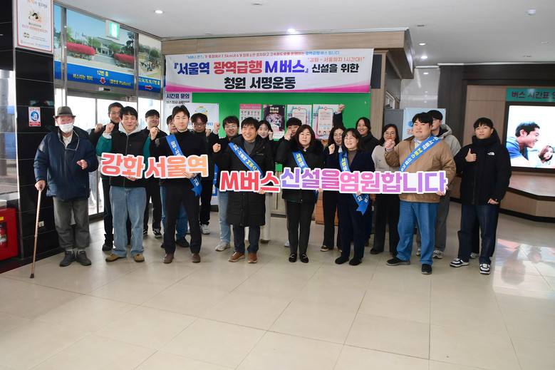한편, 강화군은 이달부터 서울역 직행 M버스 노선 신설을 위한 범군민 서명운동을 본격 추진하고 있다. 서명운동을 통해 군민들의 염원을 하나로 모아, 이를 국토교통부 대도시권광역교통위원회 노선 공모 신청 시 제출해 상반기 내 가시적인 성과를 도출한다는 계획이다.