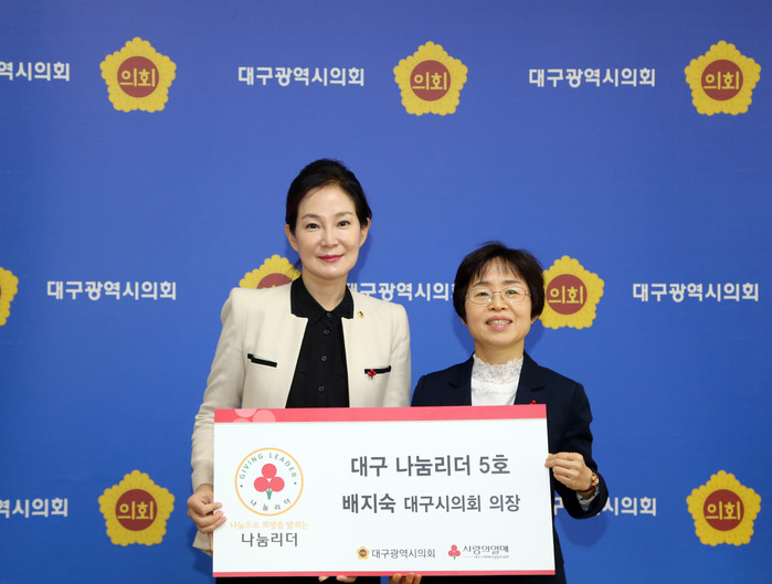대구광역시의회 배지숙 의장은 “우리 대구시민들에게는 어려울 때 자신의 것을 아낌없이 내어 놓으며 이웃을 돌아보는 데 앞장서 온 자랑스런 ‘대구정신’이 살아 있다”고 말하고, “저의 작은 나눔을 통하여 우리 시민 한 사람 한 사람이 대구의 나눔 온도를 높이는 일로 확산되는 데 도움이 되었으면 한다”며 시민들의 적극적인 참여를 요청했다.